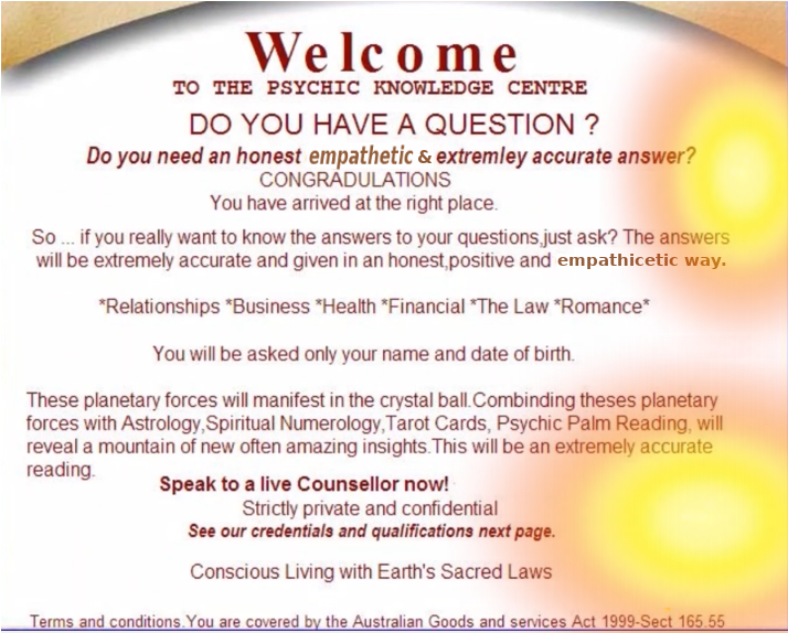 The original Psychic Knowledge Centre was established over a decade ago. Our new name change refects the times we are living in. The answer is Love, Meditating and seeking wisdom from the anceints. Combining theses planentary forces with Astrology, Numerology, Tarot reading and Psychic Palm readings. These combined with current insights counselling, Often reveal an amazing mountain of new insights, and suprising out comes. We want to see you enjoying your life with zest, living in the highest of vibrations, lazer focused with maximum health and well being. All for the good of your higher self. Let go be the person you want to be. Talk live we are waiting for your call.