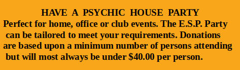 Invite ten or more of your friends relatives, neighbours, and co-workers over to participate in an exciting afternoon or evening that they will never forget! Each person will have the opportunity to take part in demonstrations of their incredible mental powers.